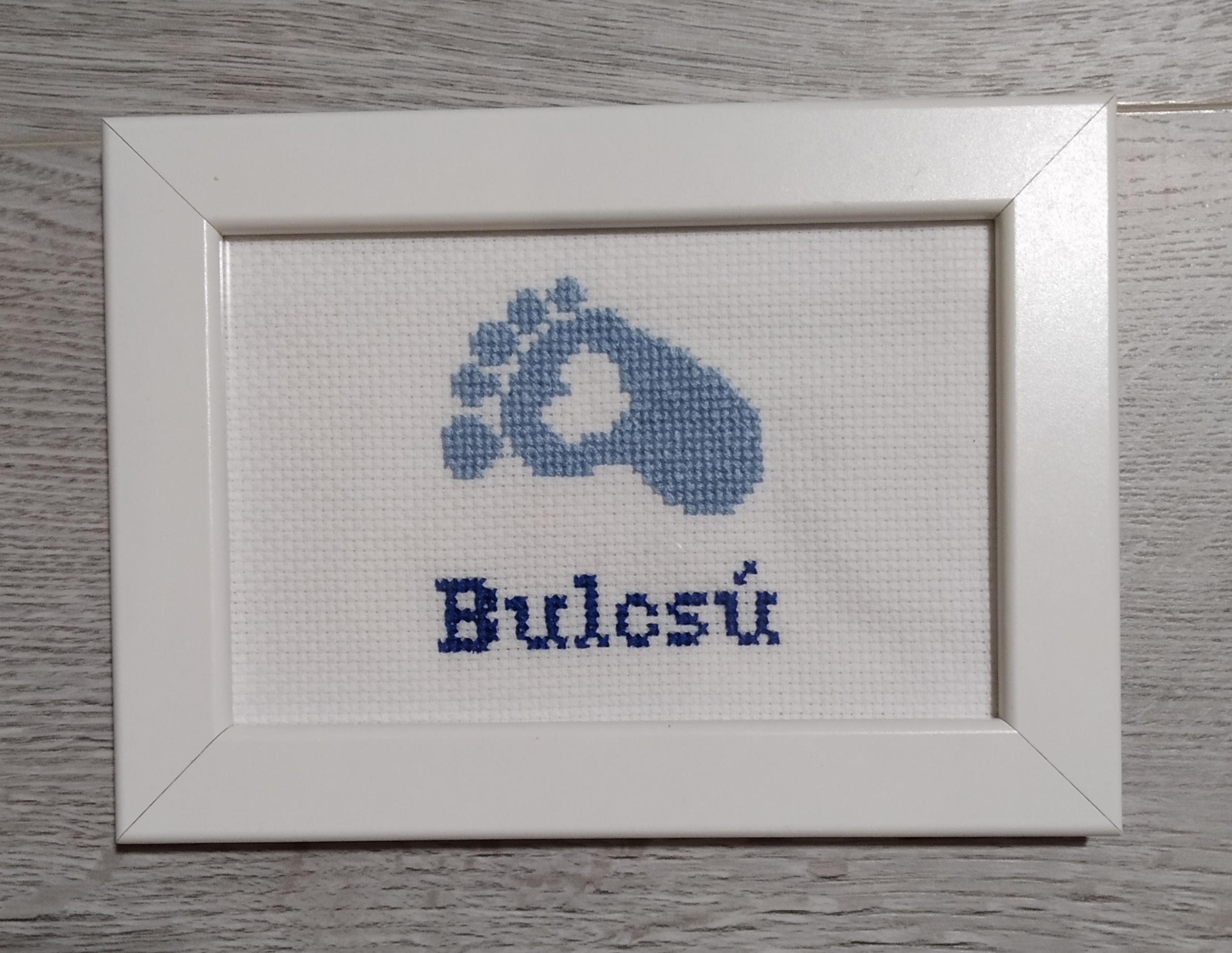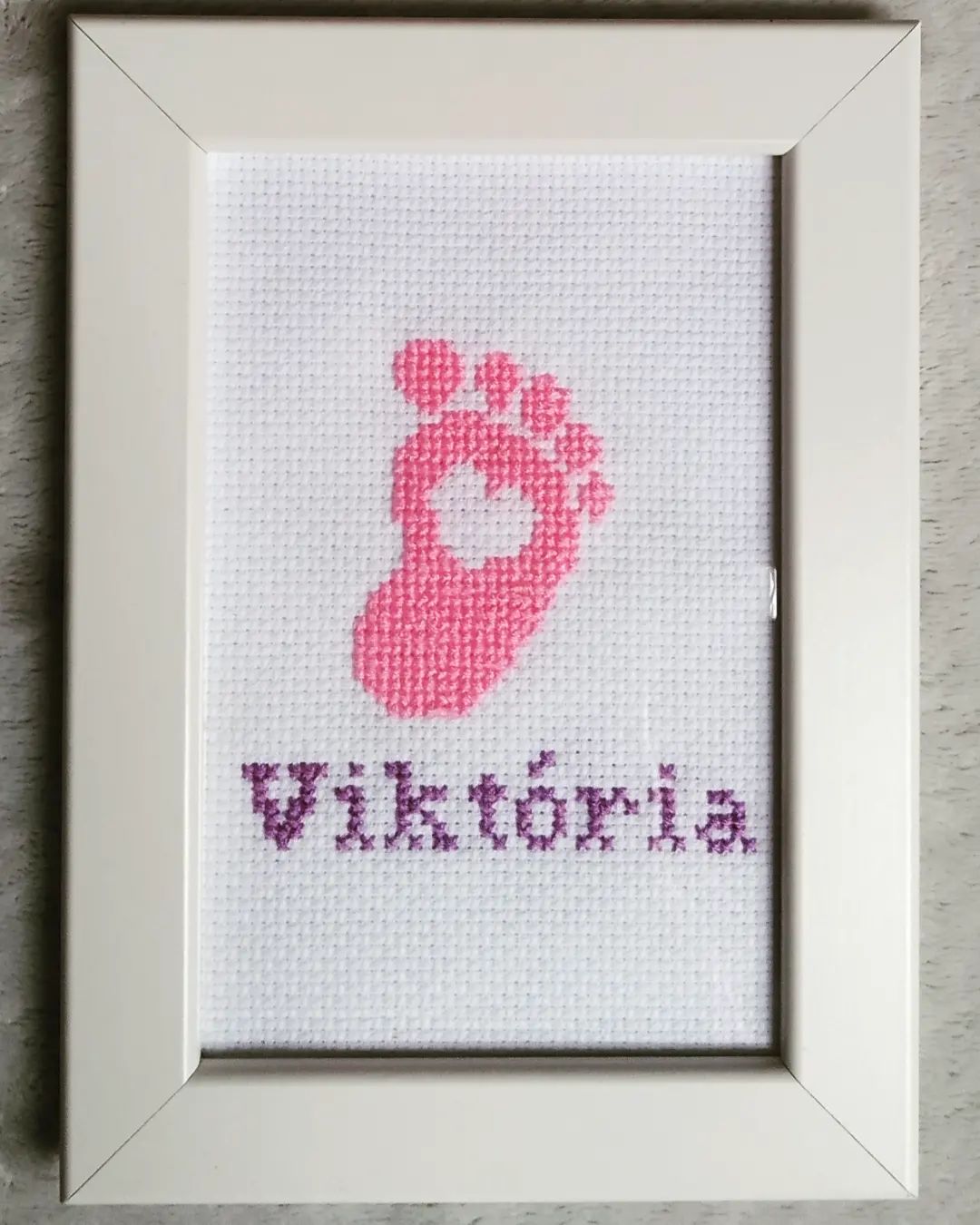 Keresztszemes hímzéssel készül, a rajta szereplő név és a színösszeállítás is tetszőlegesen választható. Álló és fekvő formátumban is kérhető.