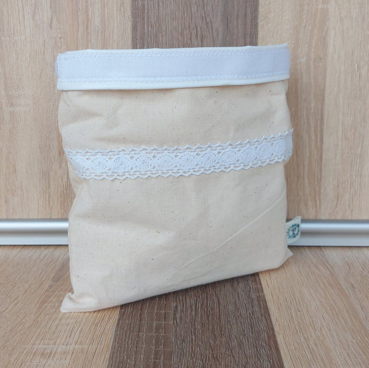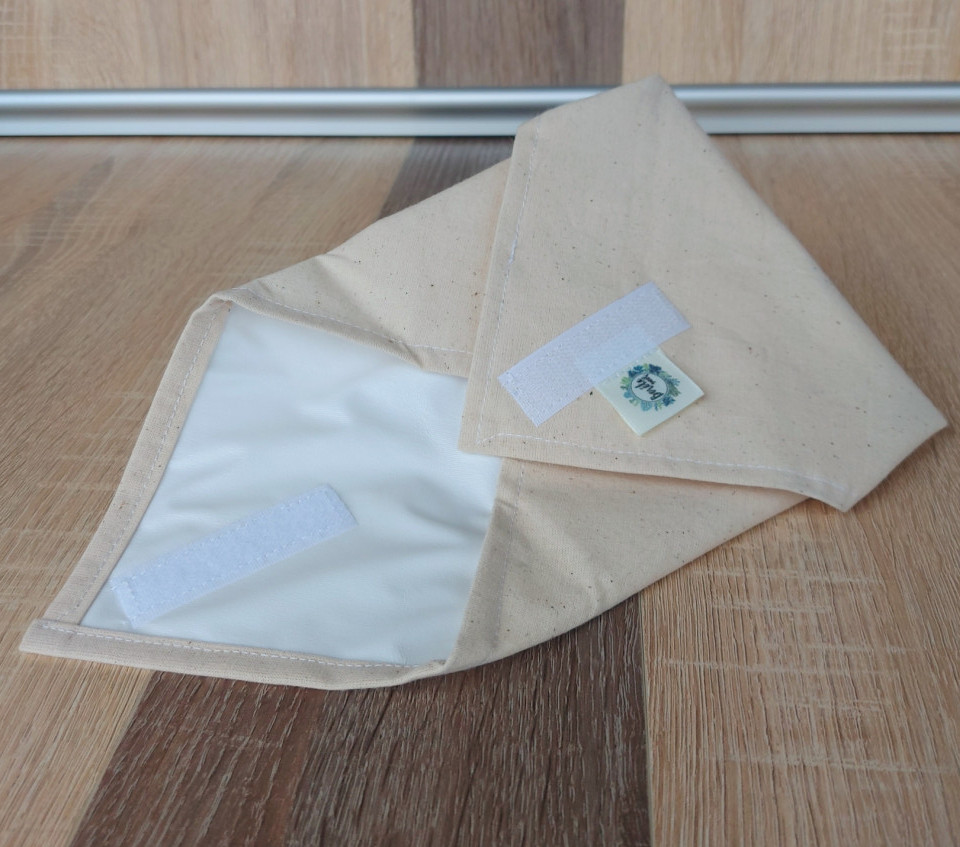 Anyaga: kívül pamutvászon, belül vízlepergető, letörölhető PUL anyag. Ez a bélés élelmiszerre és egészségre ártalmatlan anyag, amely kiváló légáteresztő és nedvességzáró tulajdonságánál fogva frissen tartja a bele csomagolt ennivalót. Szükség esetén mosható akár magasabb hőfokon, vagy csak egy nedves ruhával is letörölhető.